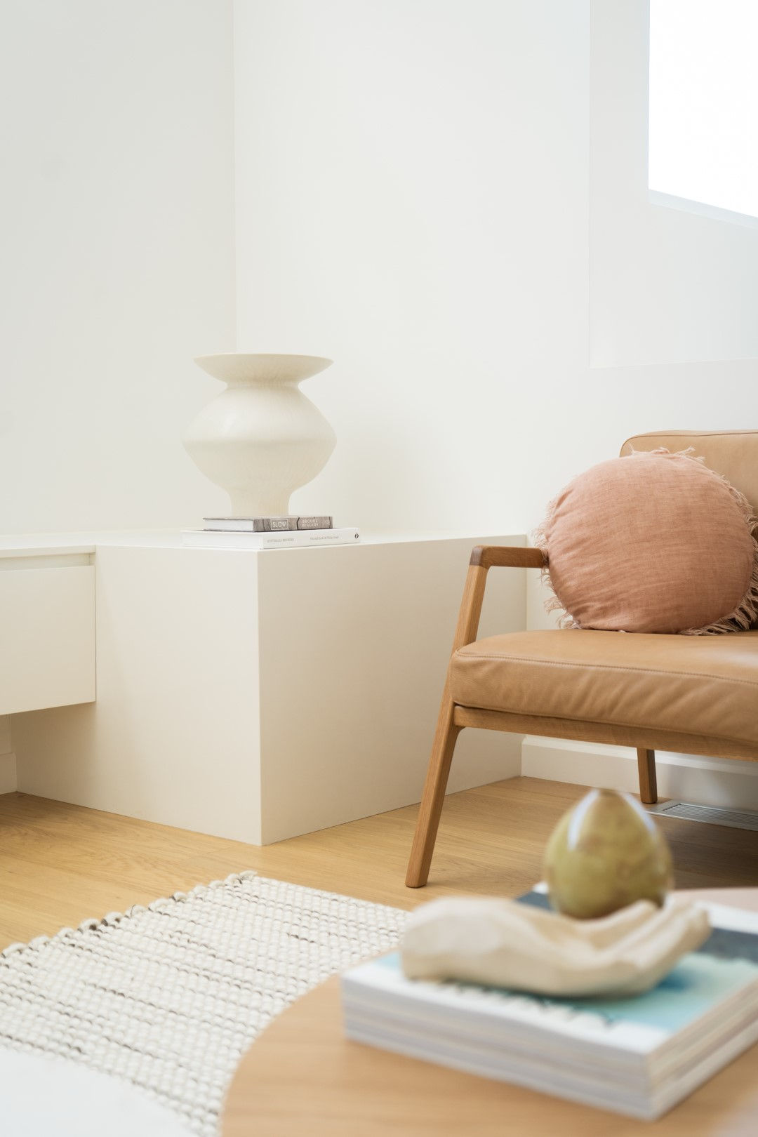 Raked ceilings, soft natural light, timber and brass details bring warmth and sophistication to the space.